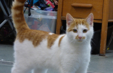 Cute huh? She’s tiny. At about nine months old, she will probably not grow much more. She’s full of energy and very confident and friendly. She spent 3 months on a building site, but must have had a proper home at some time to be so nice. After 2 weeks Olly is tolerating her, sometimes pouncing before she does. She hisses more than he does. She’s a small white and orange tornado, dashing around the house. Not going out for another couple of weeks, but she eats alongside Olly and sometimes steals his food.