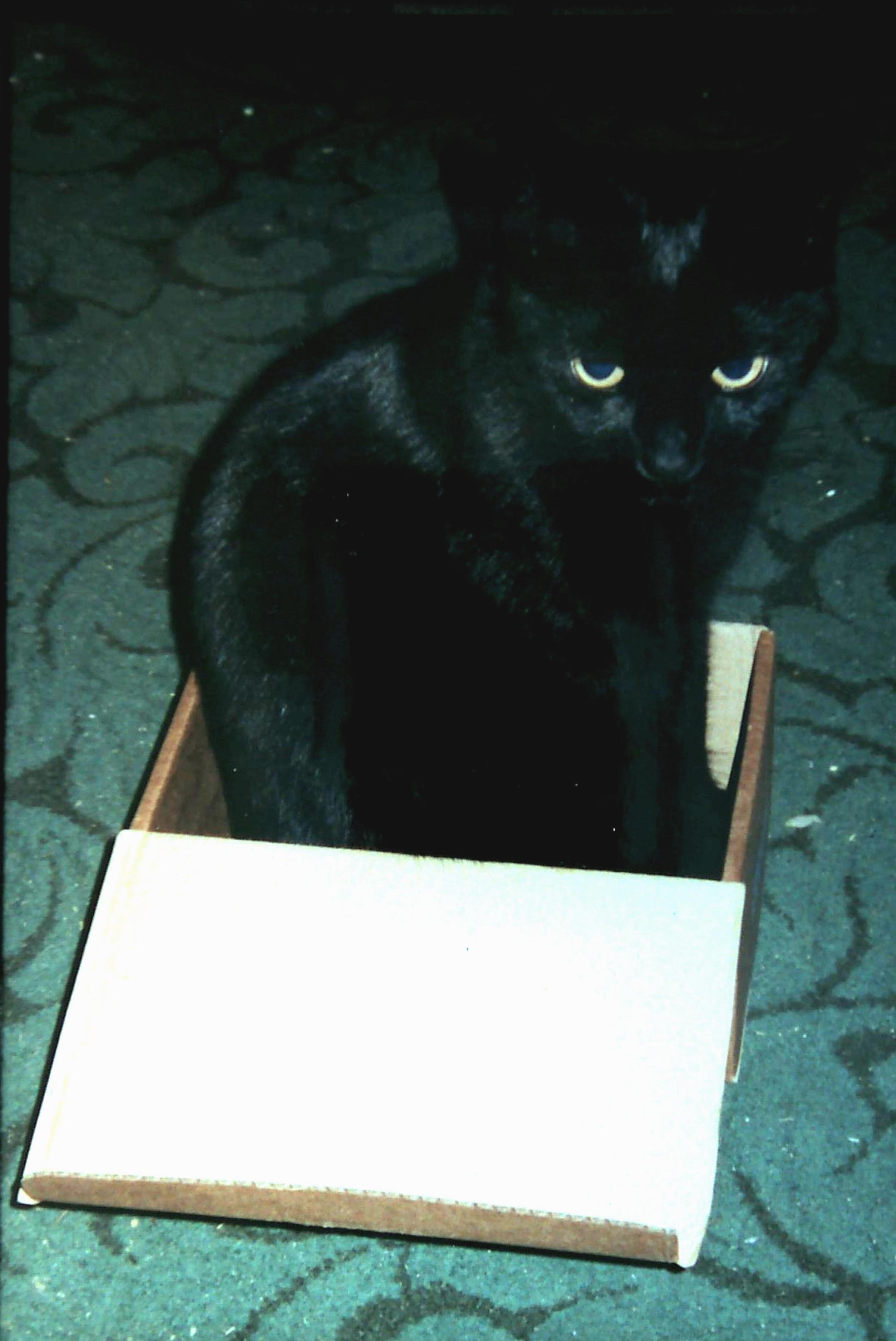 He started visiting me when the Scotts had their first child. I was scrupulous about not feeding him, but a certain F. Grove was less so. He would always turn up when there were people around. When he was young he used to be a bit untidy with his tongue and would drool when he was purring. He had a real obsession with cardboard boxes. Here we see him about to try out a new one. If I had a parcel delivered and took it up to bed to open, he would paw at it until he got the chance to try it.