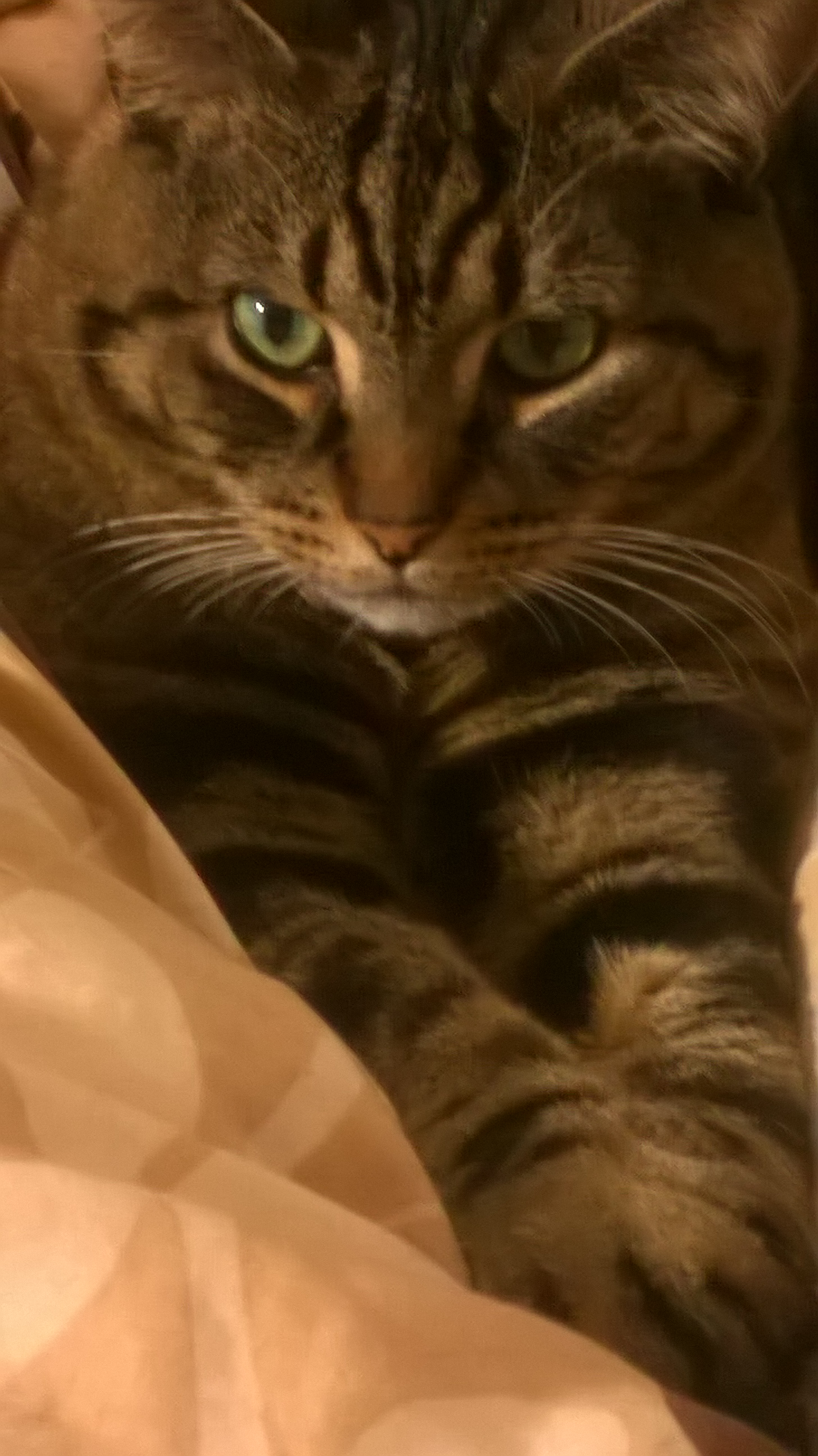 He’s a big tom tabby, Bullseye pattern. He ran away after 2 weeks, moving in with an elderly female cat. After another couple of weeks he’s fine. When I first had him he moved silently. Now he stomps about the place.